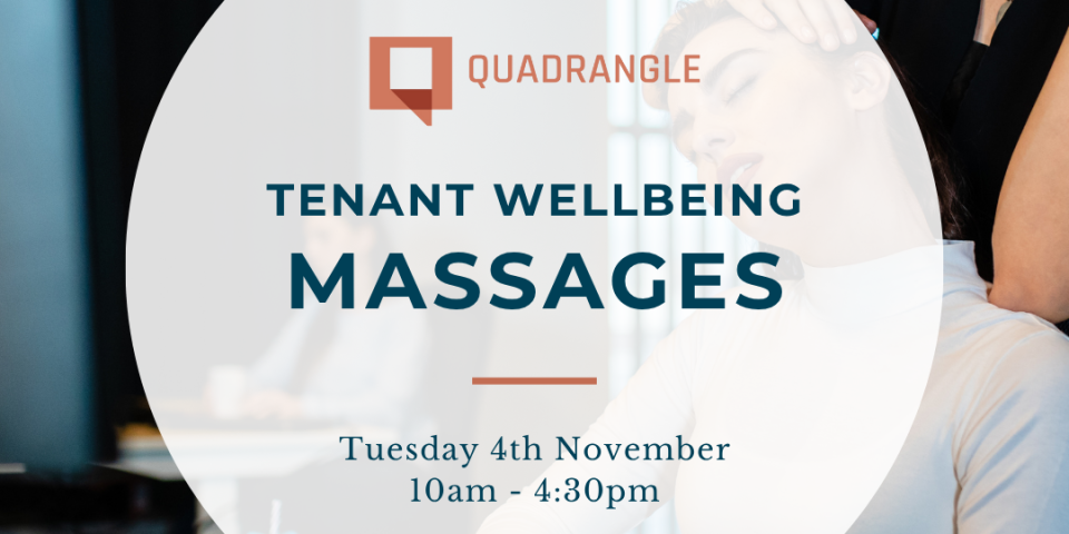 They’re back! If you didn’t get a chance last time, now’s your chance. Tenant wellbeing massages return to The Quadrangle on Tuesday 4th November from 10am to 4:30pm. Step away from your desk, relax and recharge. Secure your spot through the monthly newsletter, emailing reception or using this link: Schedule Appointment with Office Vitality – spaces fill up fast!